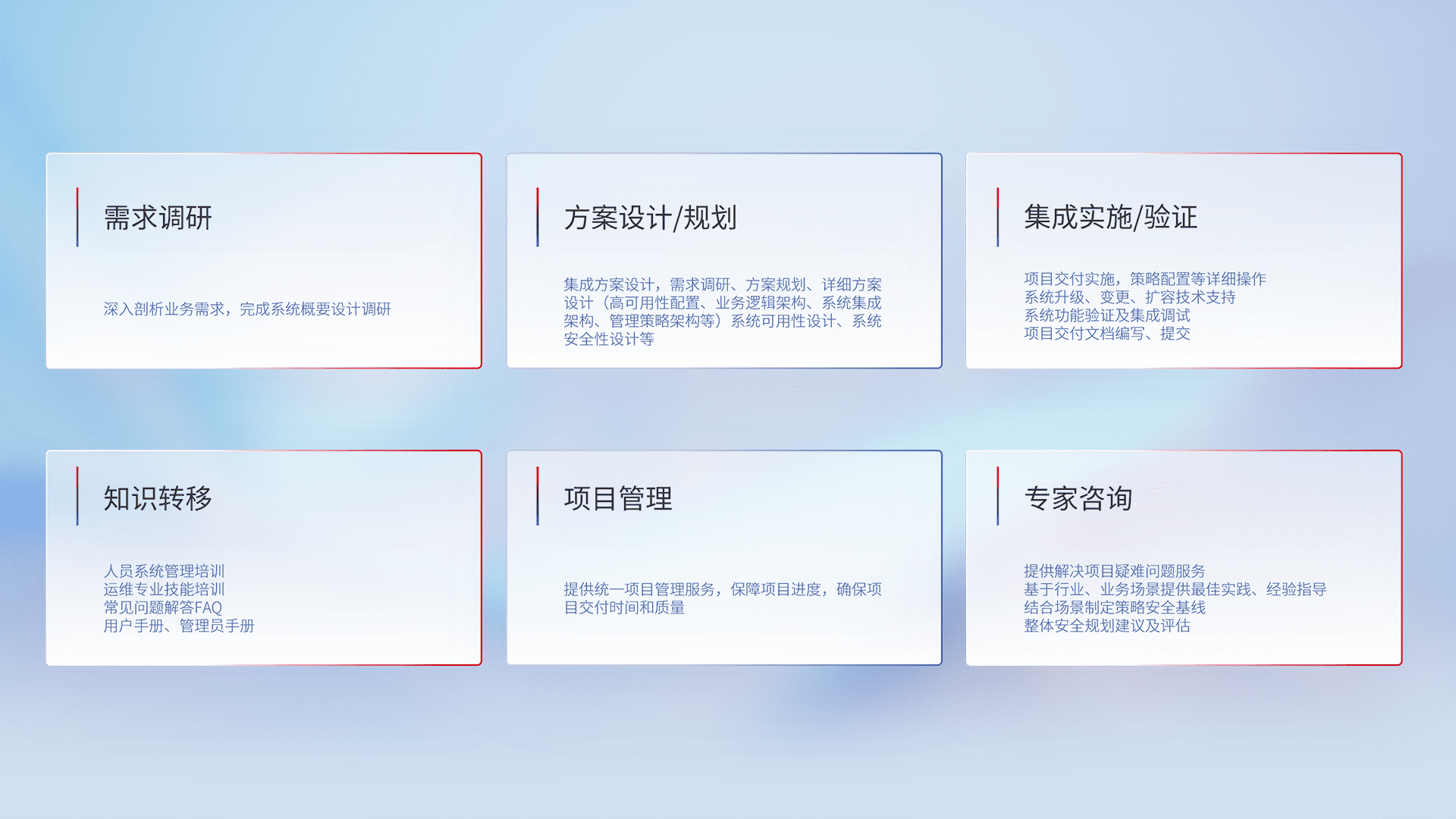 针对客户行业特性,,,,将宏观的安全战略和需求,,通过专业的交付服务,,实现项目落地,,为客户提供标准规范的集成交付服务。。